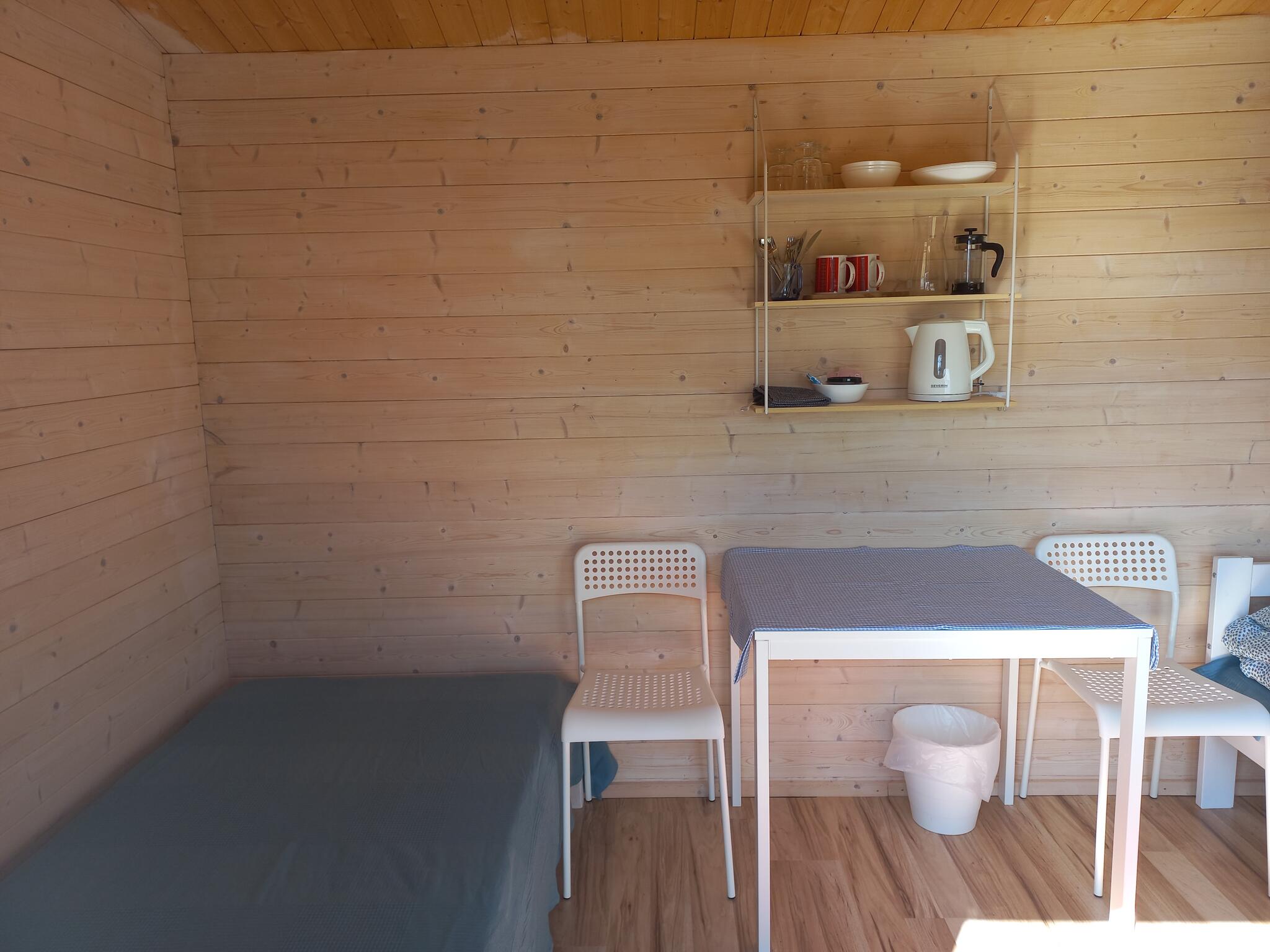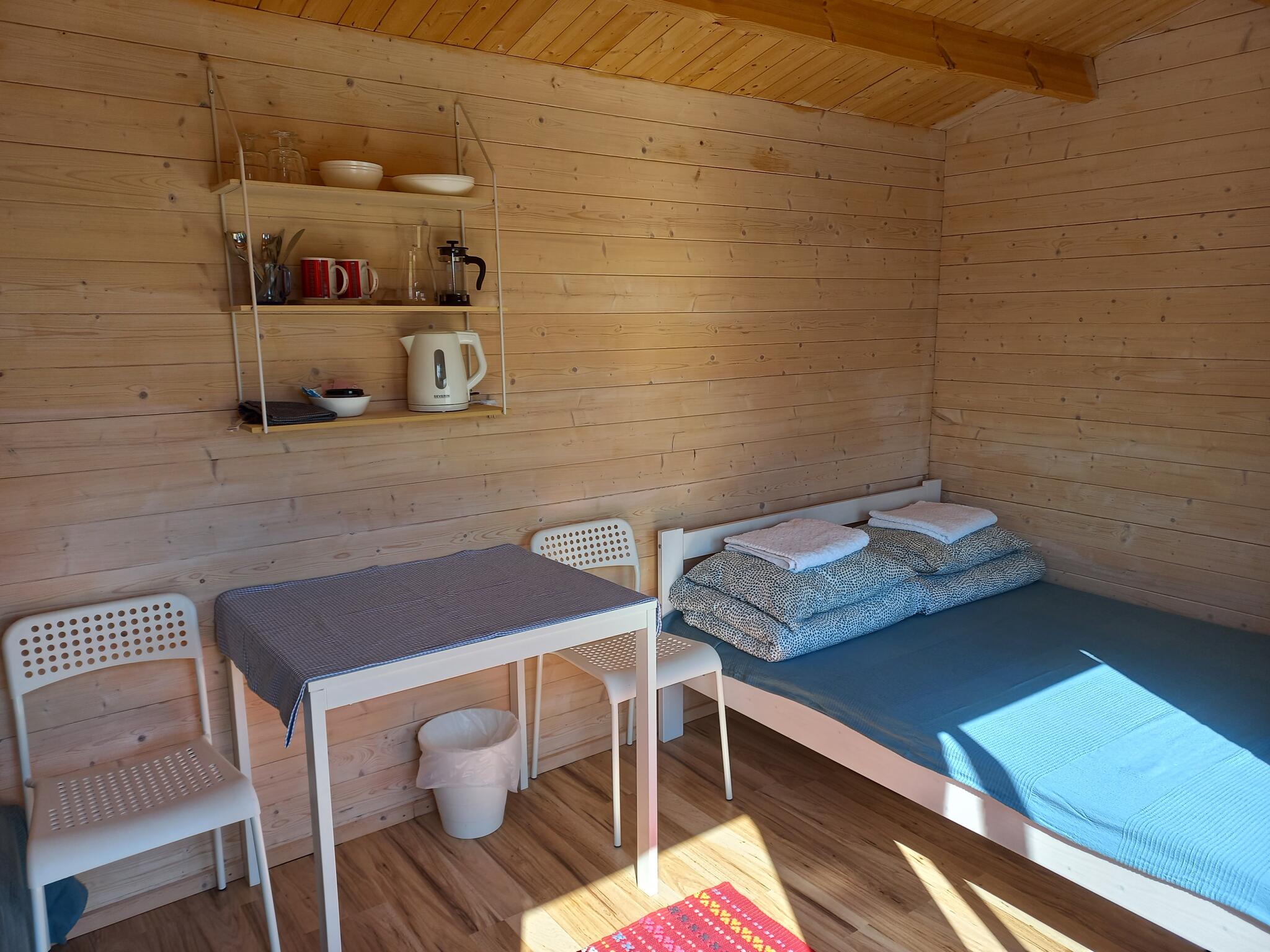 Kämpingumajas on kolm magamiskohta, 1 lai ja 1 üheinimese voodi. Majas olemas voodipesu, rätikud, veekeetja ja nõud.