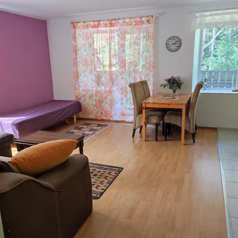 KORTER NR 7: Sinu käsutuses on viibimise ajal köök/elutoaga ning eraldi magamistoaga armas korter.  Olemas on wc/duss. Korteril omaette väike rõdu.Korterisse mahub mugavalt ära 3 inimest. Köök/elutoas on ka lahtikäiv suur diivan. Magamistoas on üks lai ja üks kitsas voodi.